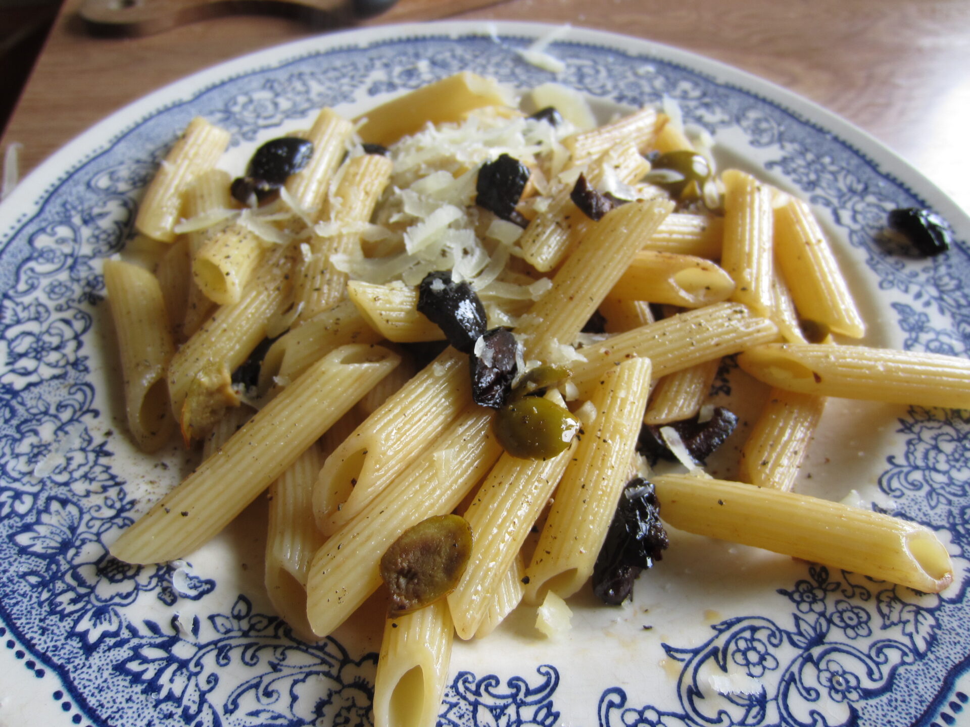 Dénoyauter les olives noires et les olives vertes et couper les en 2 ou 3. Faire revenir le tout 5 min dans l’huile (d’olive of course), avec de l’ail et un peu d’eau. Cuire les Penne Rigate dans une grande casserole d’eau salée (pas trop car les olives noires apportent déjà une bonne dose de sel), égoutter al dente, faire sauter avec les olives, poivrer et le tour est joué. Ça m’a pris? 15 minutes et quelques secondes pour râper un peu de fromage.