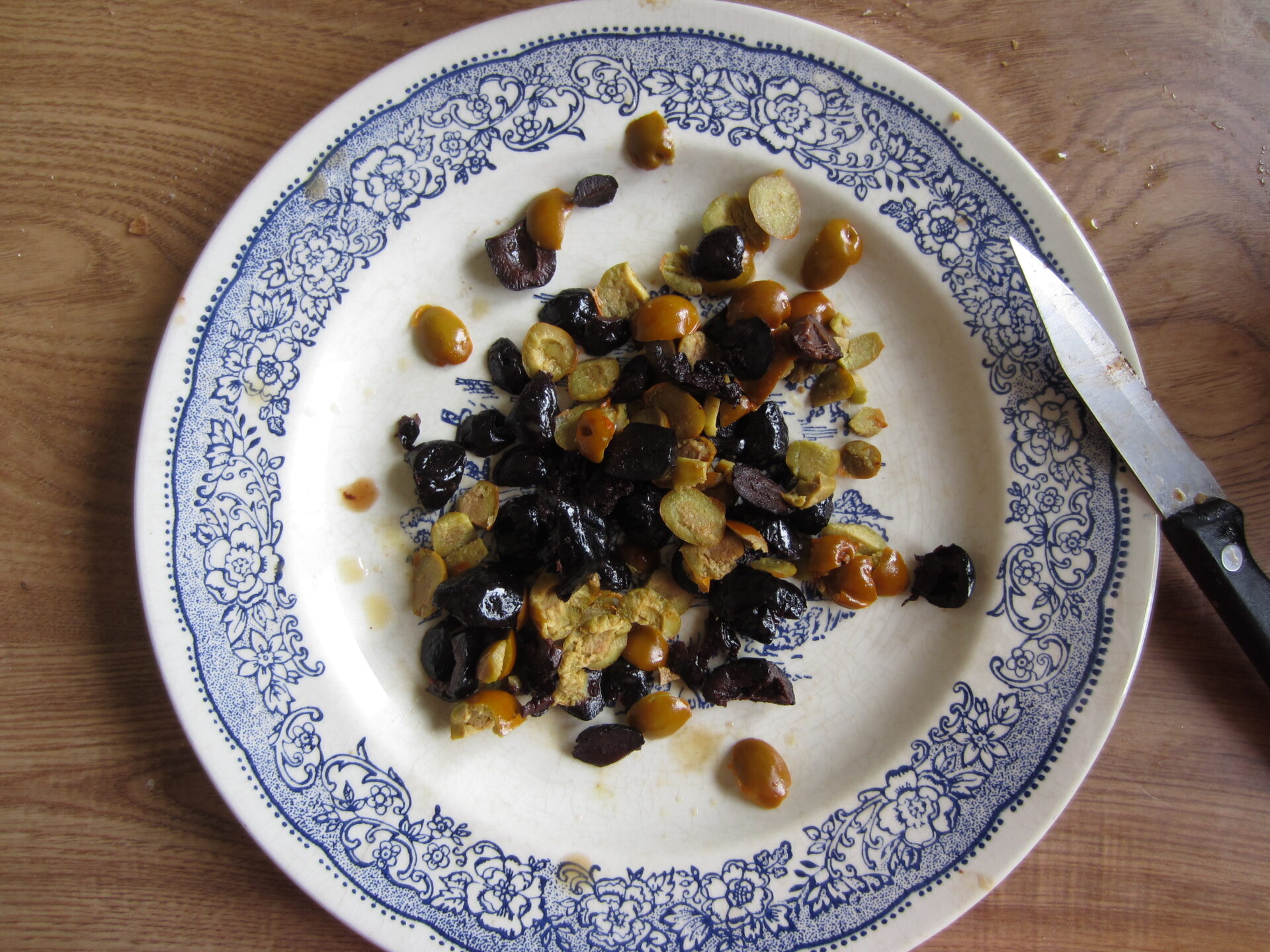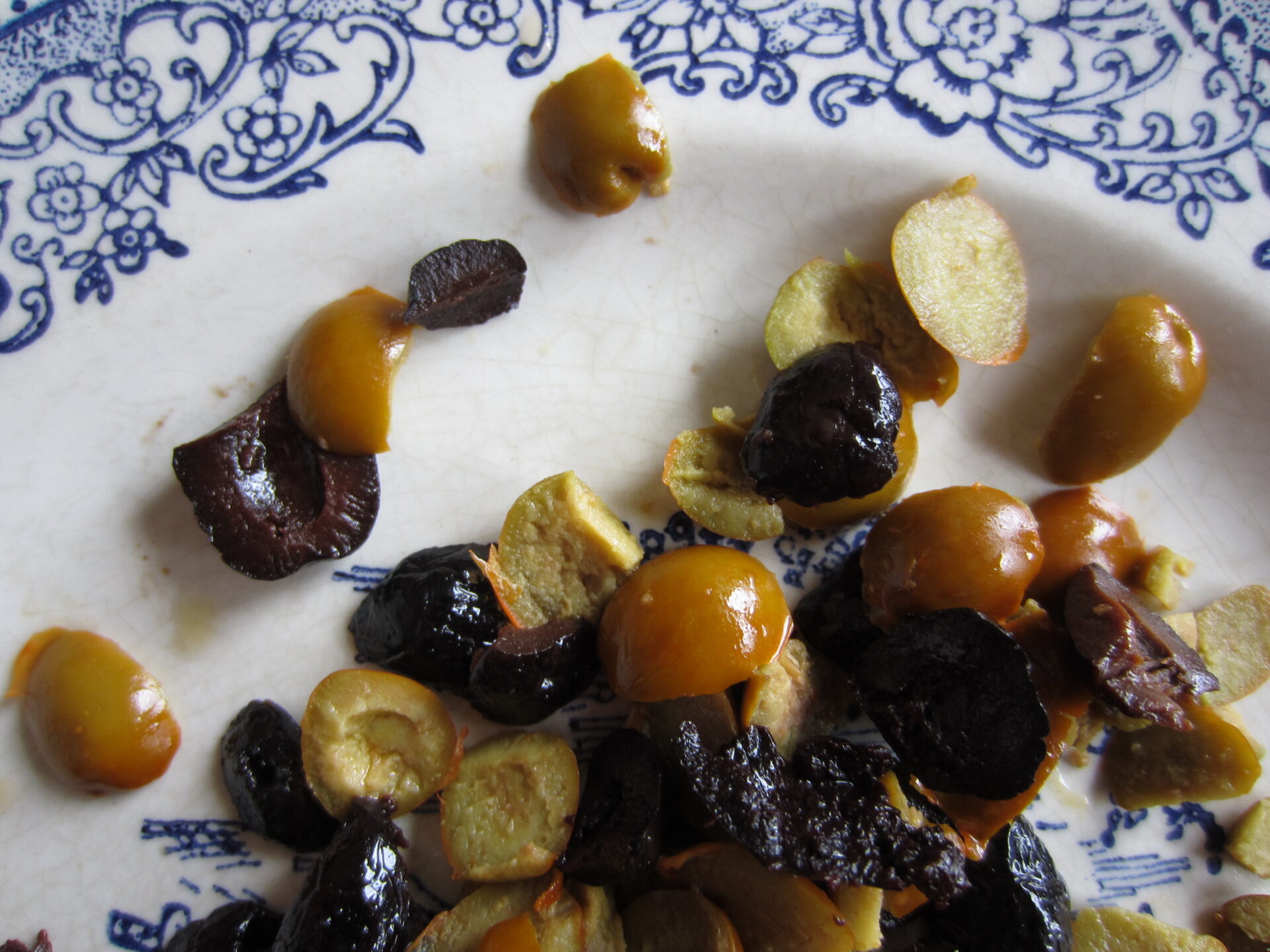 Pour 350g de pâtes: une dizaines d’olives noires (ici à la grecque), et la même chose pour les olives vertes (j’avais dans mon frigo un bocal d’olives “Gazpacha”, légèrement relevée au piment rouge), 3 cuillères d’huile d’olive vierge extra, sel, poivre.