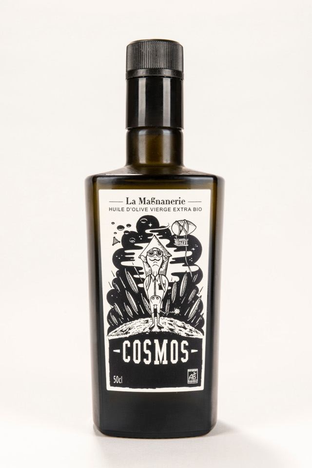 Cosmos est notre haut de gamme, 100% Leccio del corno. On est sur une sélection parcellaire et une monovariable 100%. C’est notre grand cru. On a eu le prix Flos olei 2022 et 2023. On a créé cette parcelle sur un coup de cœur pour un terroir particulier. Parcelles au sommet d’une colline, entourée à 100% de bois.