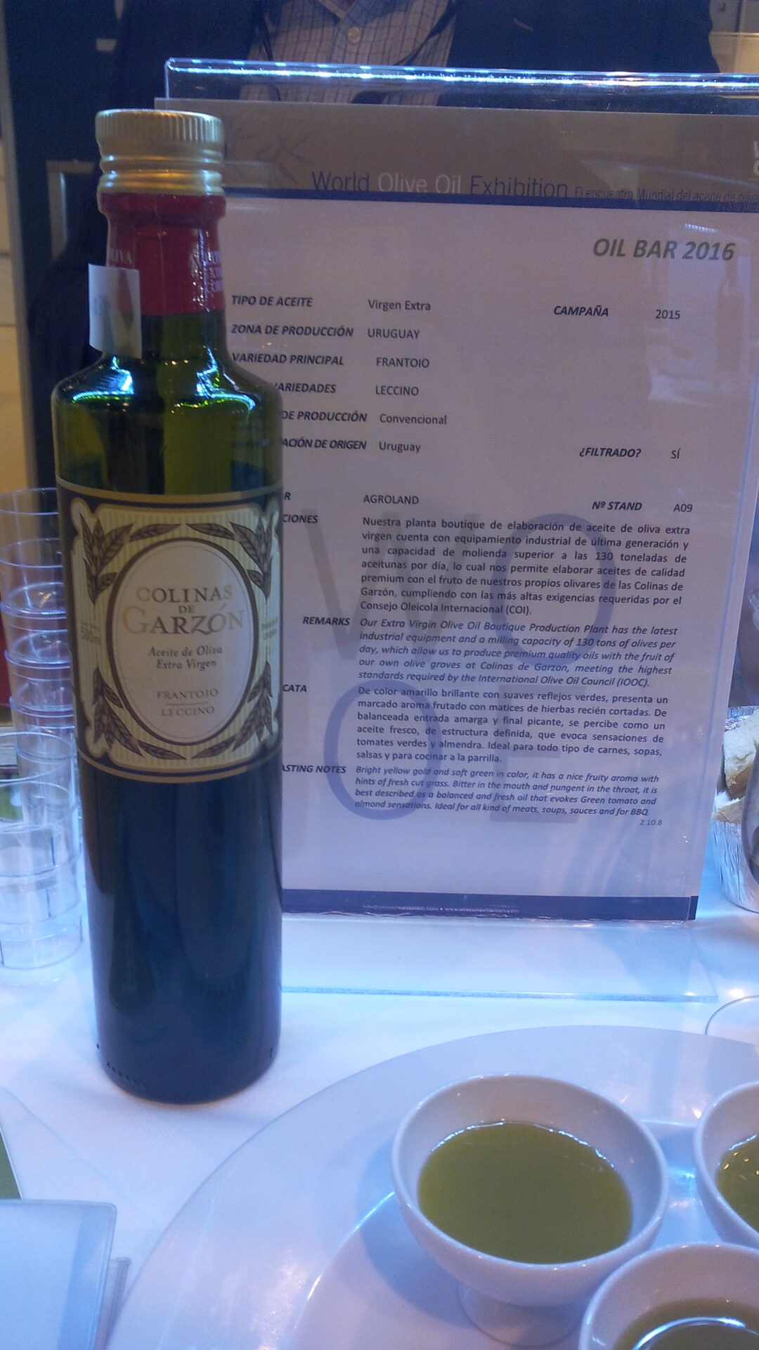 - L’huile d’olive Colinas de Garzón Uruguay couleur vert émeraude pour cette huile de l’hémisphère sud.